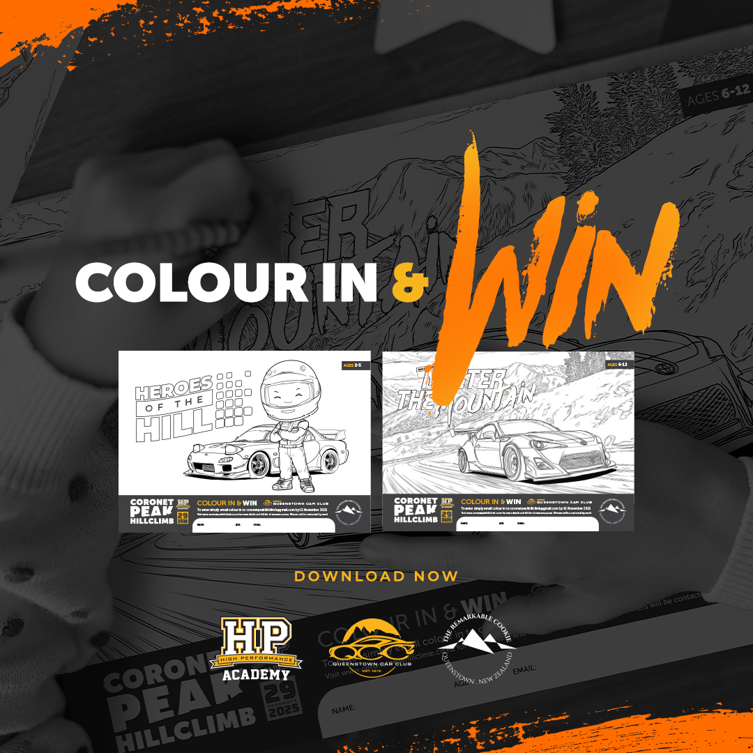 Calling all young artists and racing fans! We’re stoked to announce our epic Colour In Competition for the 2025 HP Academy Coronet Peak Hill Climb – and we’ve got some AMAZING prizes up for grabs thanks to our legends at The Remarkable Cookie!